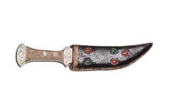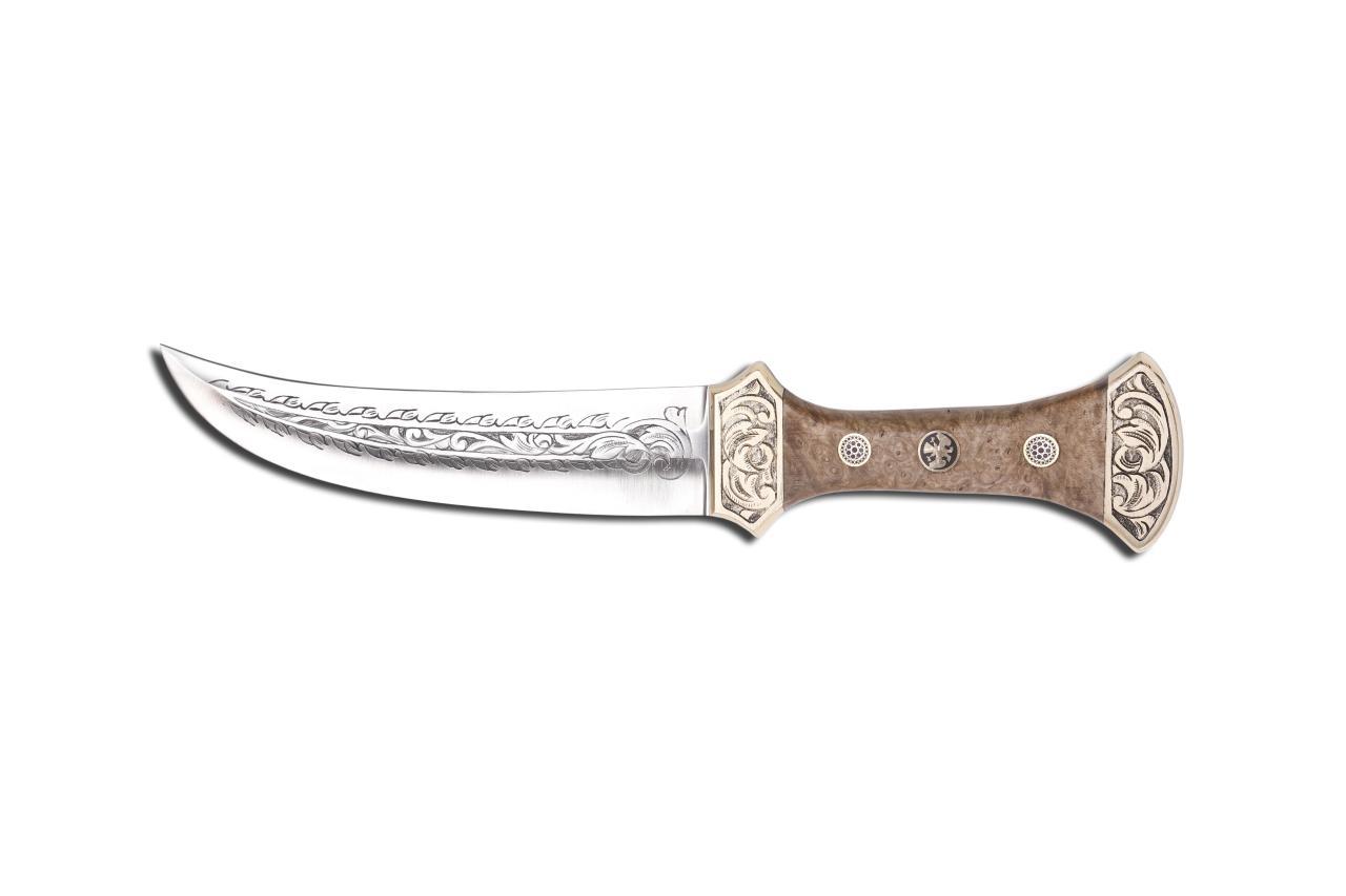 Hançer’in bu koleksiyon versiyonunda ayrıca balçak gravürle süslenmiştir ve özenle seçilen urlu ceviz sap malzemesinin yerine takılmasında mozaik pimlerden faydalanılmıştır.
